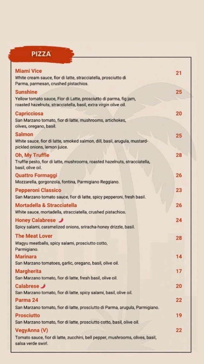 Fior di Latte, stracciatella, cherry tomatoes, prosciutto di parma, black pepper, basil, extra virgin olive oil.